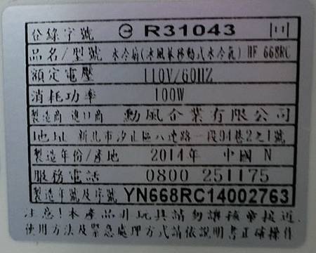 最後附上【勳風】移動式水冷氣的規格資料給大家看看,額定電壓是110V,消耗功率為100W。